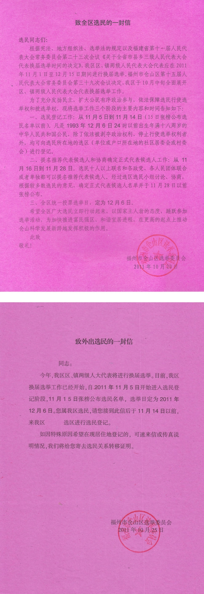 福州市仓山区选举委员会致全区选民的两封信