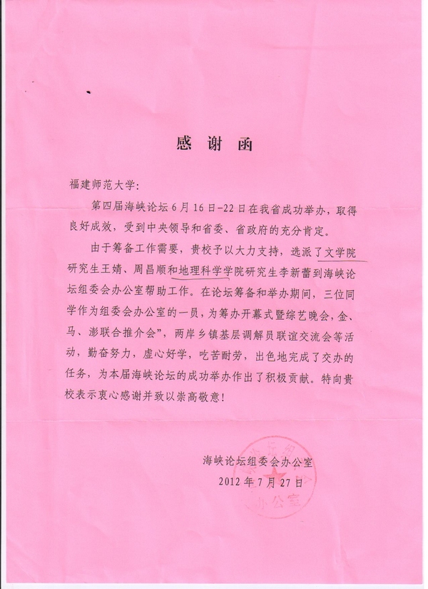海峡论坛组委会致信感谢必一在线平台(中国)官网学生为第四届海峡论坛成功举办作出贡献