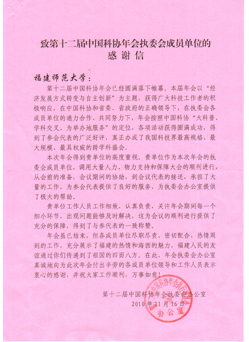 第十二届中国科协年会执委会办公室致必一在线平台(中国)官网感谢信