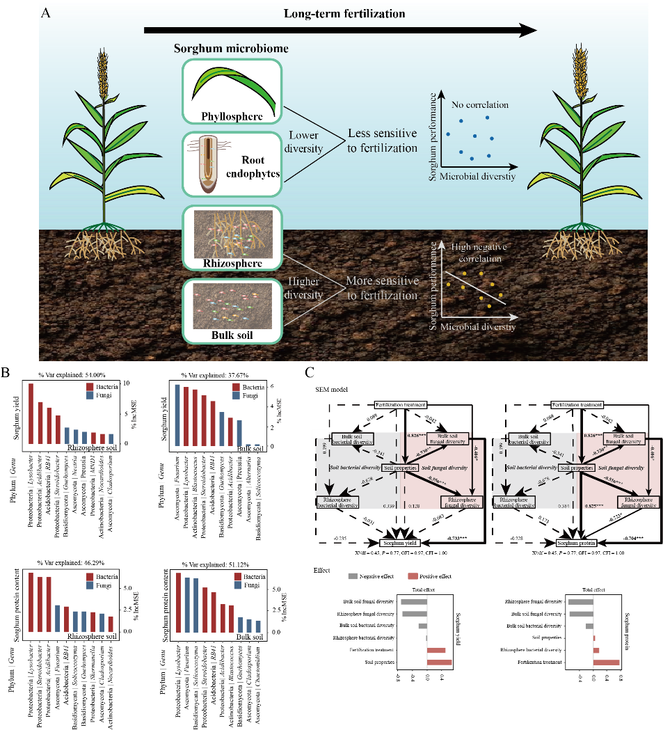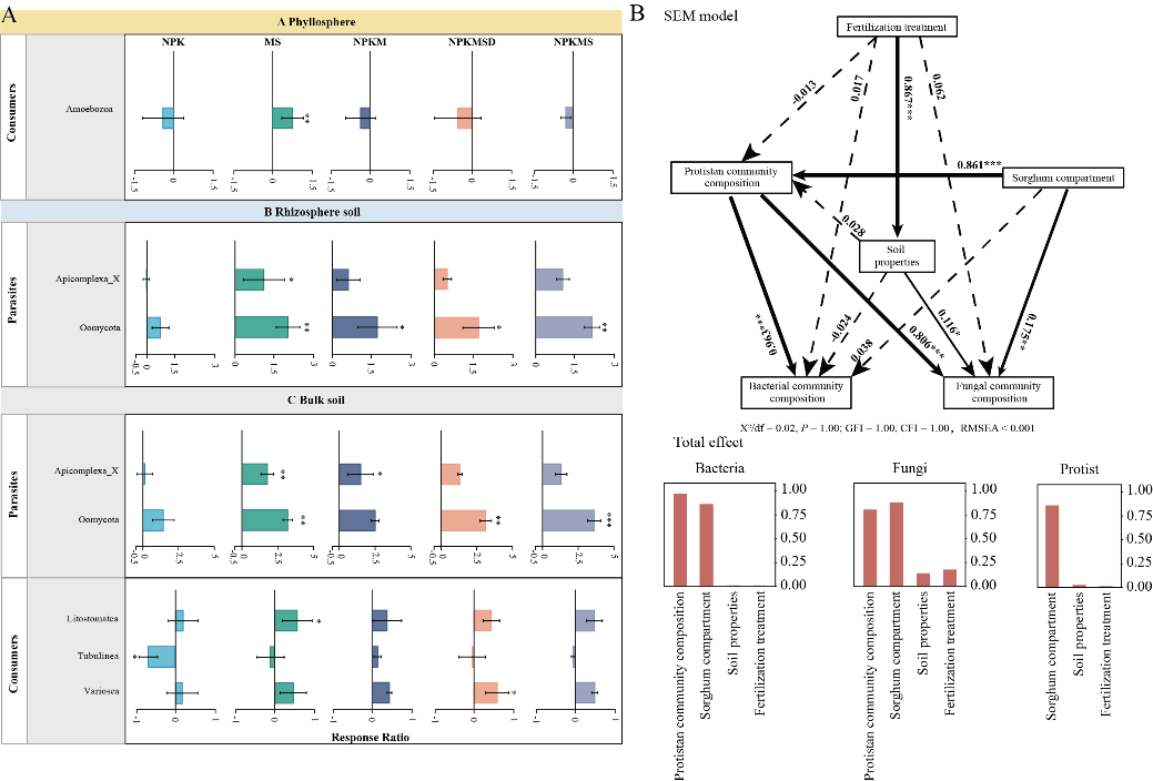 近日,必一在线平台(中国)官网地理学院土壤生态学研究团队在土壤-植物微生物组相互作用方面取得重要进展。该团队基于不同农田管理措施长期定位试验,通过高通量测序等手段研究了高粱叶际、根系、根际土和非根际土中细菌和真菌的群落结构及其对不同农田管理措施的响应,发现不同农田管理措施显著影响植物微生物组中细菌和真菌的群落结构,对土壤微生物群落的影响更为显著,对叶际和根内微生物群落影响相对较小。农田管理措施会通过影响土壤微生物多样性显著影响作物的性状表现(如作物产量和蛋白质含量),土壤微生物组具有预测作物产量的潜能(图1);农田管理措施也会显著地改变原生生物中的捕食者和寄生生物等功能类群,方差分解分析和结构方程模型的结果显示捕食者和寄生生物可能会通过食物网相互关系直接或间接影响与植物相关的细菌和真菌群落。这一发现为利用原生生物调控植物微生物组,进而影响植物性状表现提供了新的视角(图2)。该研究成果目前以题为“Microbial communities in crop phyllosphere and root endosphere are more resistant than soil microbiota to fertilization”和“Fertilization alters protistan consumers and parasites in crop-associated microbiomes”分别发表于Soil Biology & Biochemistry和Environmental Microbiology期刊,该团队2019级博士生孙安琪为第一作者,胡行伟研究员为通讯作者。团队贺纪正教授、郑勇研究员和林永新副研究员参与了本项工作。以上研究得到了国家自然科学基金项目(No. 31901291)的资助。