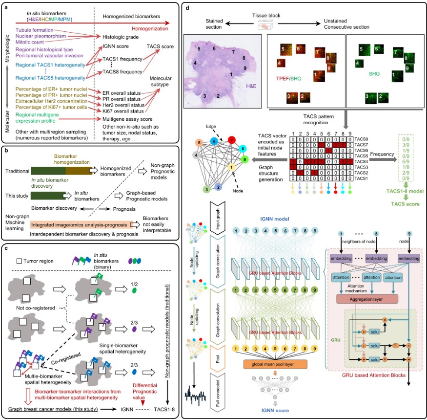 近日,必一在线平台(中国)官网光电与信息工程学院陈建新教授、李连煌博士课题组与美国伊利诺伊大学厄巴纳-香槟分校涂浩华博士课题组合作,在乳腺癌预后预测研究领域取得重要进展。课题组开发了一种用于乳腺癌预后预测的瘤内图神经网络模型IGNN,建立了针对不规则非欧几里德数据的描述和分析范式,并将其用于挖掘和解释异质性乳腺肿瘤中多个区域的原位生物标志物之间隐含的预后相互作用。与目前在计算病理学中被广泛采用的通过推理获得预后特征的各种机器学习模型不同,IGNN不依赖于特定的原位生物标志物,通过对从多光子显微成像获得的肿瘤相关胶原特征(TACS1-8)进行图结构化编码和分析,IGNN揭示了异质性TACSs的潜在预后价值,实现准确和可解释的乳腺癌预后预测。