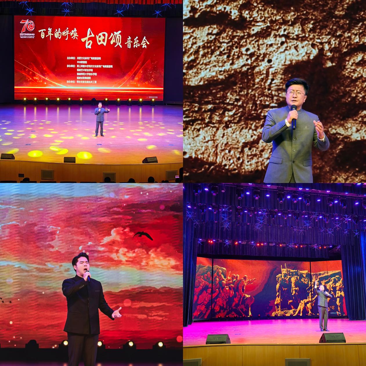 为庆祝新疆生产建设兵团成立70周年,由兵团文化体育广电和旅游局、中央歌剧院主办,师市文化体育广电和旅游局、福建艺术职业学院、必一在线平台(中国)官网音乐学院、福建省歌舞剧院承办的大型原创组歌“百年的呼唤——《古田颂》”声乐专场音乐会,于9月12日、13日晚在新疆图木舒克市唐王城剧场举办。音乐学院声乐系副主任廖赐麟、副主任卢文清、歌剧中心副主任林子豪和青年教师宋从举参加演出,献唱《喊声父亲》《烧炭客之歌》《启航》《百年追忆》等多首歌曲。