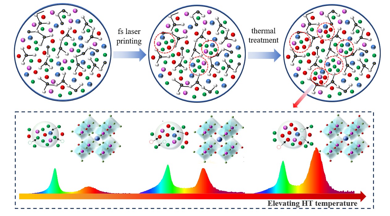 近年来,飞秒激光直接写入技术已被证明是一种在玻璃基体中诱导钙钛矿量子点(PeQDs)局部结晶的有效方法。通过不断调整激光参数可改变卤素离子的比例,从而改变钙钛矿结构的带隙,但目前尚难以通过控制阴离子交换在单个玻璃基体内产生双相PeQDs,这在一定程度上影响了其实际应用。