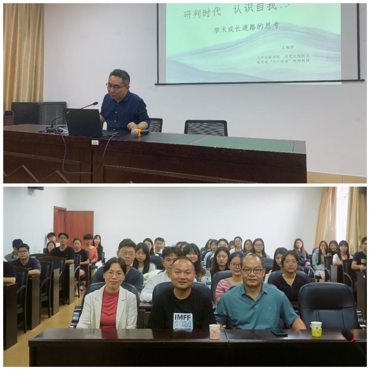 近日,传播学院开展系列学术讲座,教育部“长江学者”特聘教授、北京电影学院研究生院院长、图书馆馆长王海洲教授,浙江师范大学艺术学院副院长、博士生导师黄钟军教授应邀主讲,副院长吴青青教授、张经武教授分别主持。