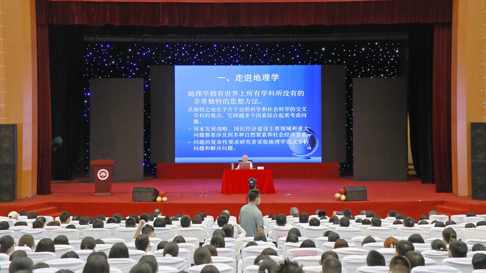 朱鹤健教授以新中国成立以来一代又一代地理学家们艰苦奋斗、砥砺前行所取得的辉煌成就为切入点,从我国基本国情、国计民生两方面阐述学习地理学的意义,并结合自身实践经历,通过长汀水土保持成功范例,深入阐明了人地关系思维、系统思维、空间思维这三大地理学核心思维,带领新生“走进”地理学,领略地理学科的独特魅力。他强调,地理学不应只停留在理论研究层面,要落“地”有声、见地及人、微入宏出,学好地理学,既要有全球视野,求索国际前沿,又要夯实家国情怀,实践区域响应,解决本土问题,提升担当国家发展战略使命感和服务社会责任感。他勉励同学们“认定目标不动摇、遇到困难不放弃、简单重复不厌烦”,希望同学们响应新时代的召唤,勤奋学习、刻苦钻研、立志成才,努力学好地理学,挑起宣传、实践现代地理学的责任,为中华民族复兴伟业贡献地理人的力量。