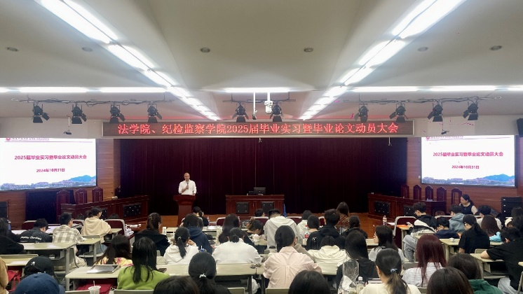 10月31日,法学院在模拟法庭召开2025届毕业生毕业就业动员大会。北京市盈科(福州)律师事务所涉外中心执行主任蓝巧惠、人事总监陈素平,学院党委副书记汪启思、副院长施志源以及2025届全体本科毕业生参会。会议由汪启思主持。