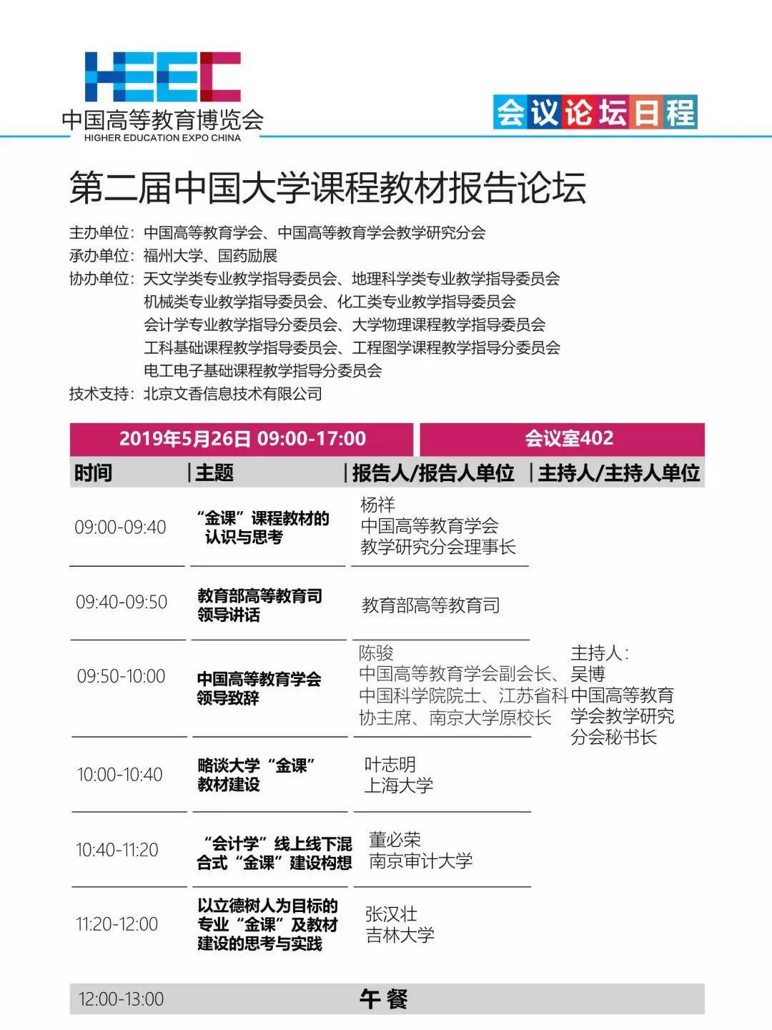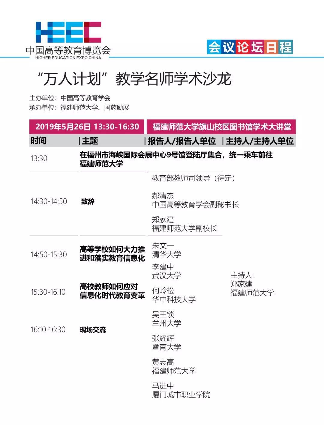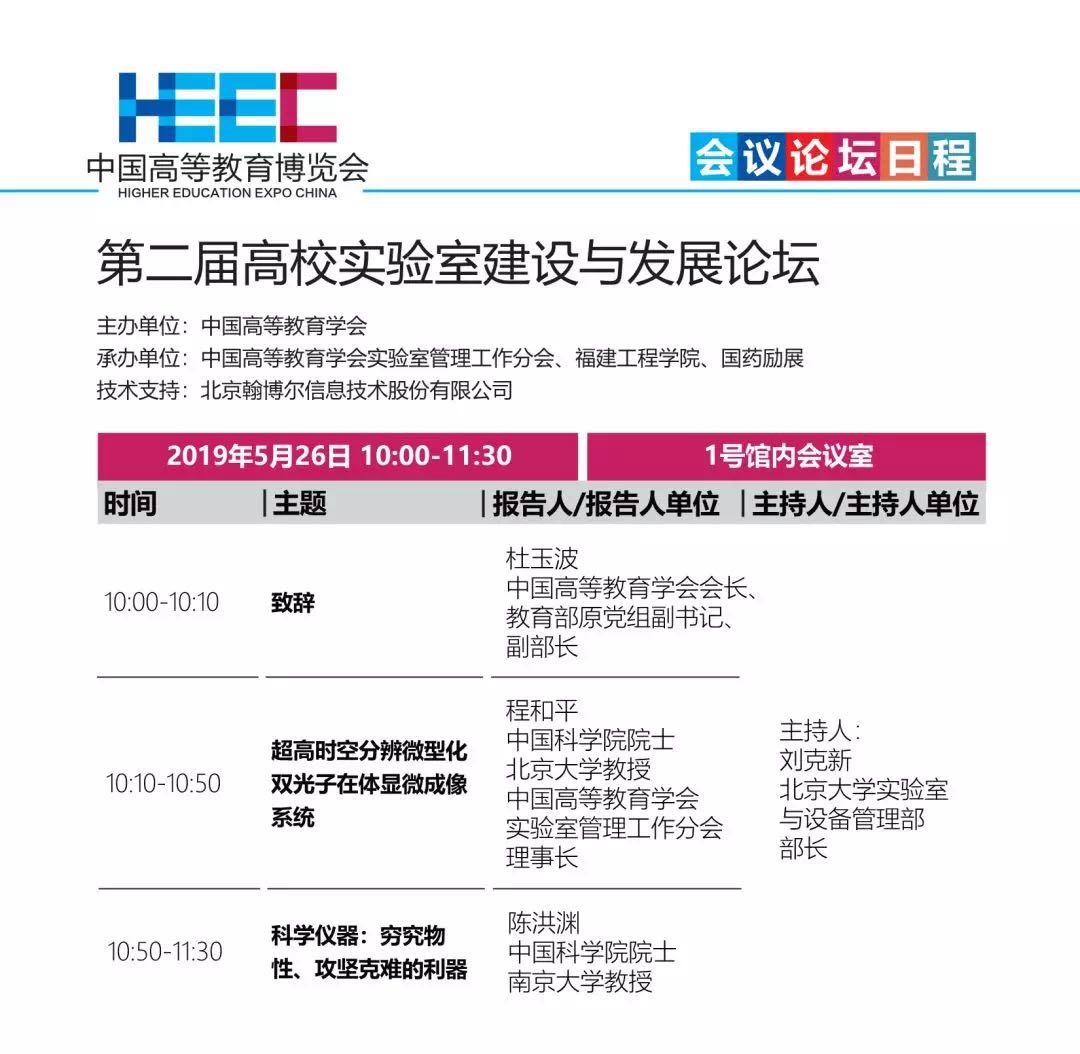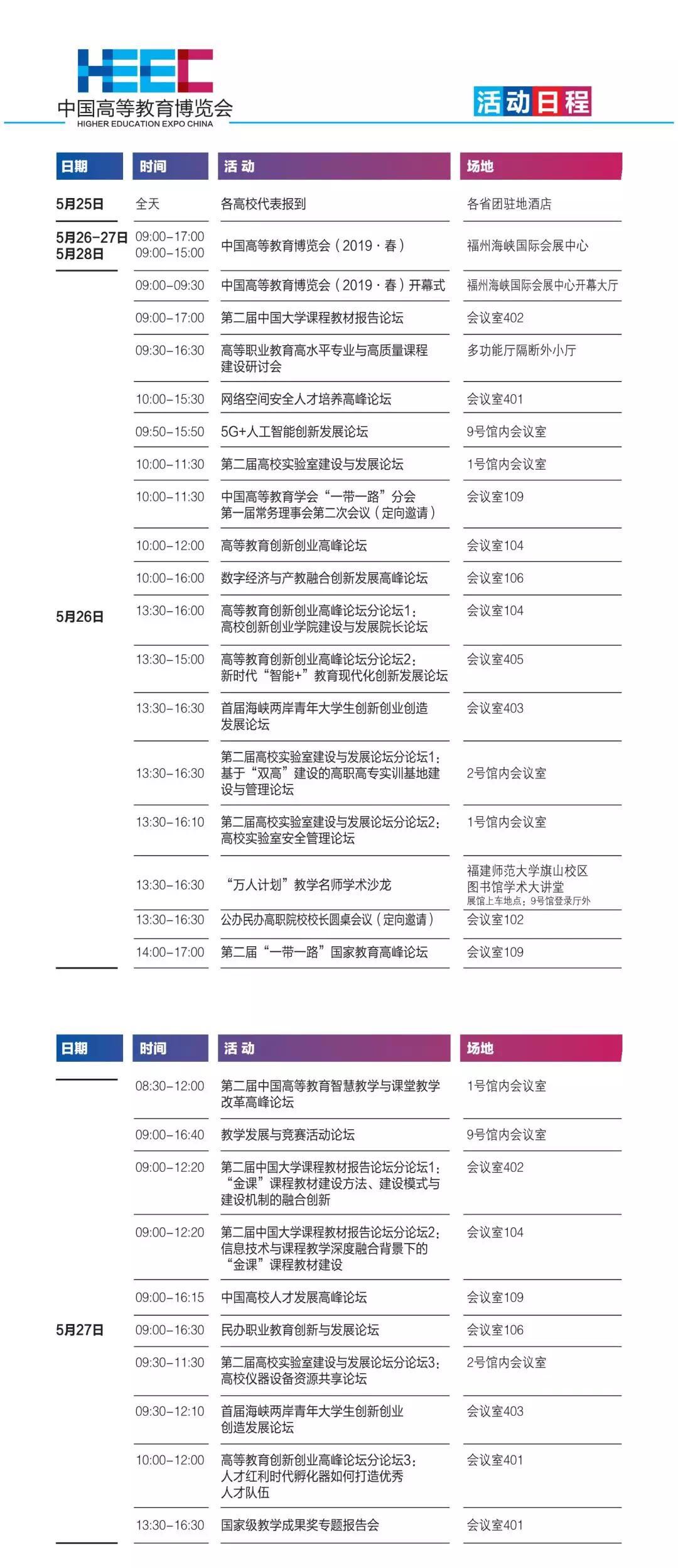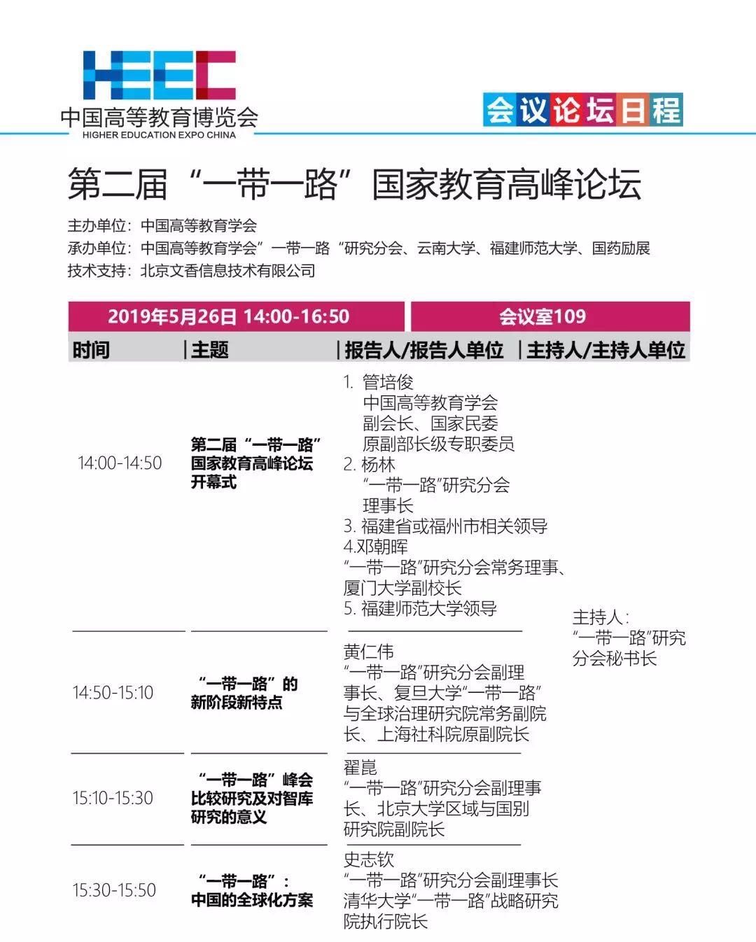由中国高等教育学会主办,福建省高等教育学会,必一在线平台(中国)官网参与承办和协办,以“讴歌新中国70年辉煌成就 推进教育现代化创新发展”为主题的中国高等教育博览会(2019·春)将于5月26日至28日在福州海峡国际会展中心举办。本届展会将为大家带来千余家参展企业、2500余个展位、6万平方米展出面积、上万件展示产品,20余个高峰论坛、160余场专题报告。其中,必一在线平台(中国)官网还作为具体承办单位承办“万人计划”教学名师学术沙龙、国家级教学成果奖专题报告会、中国高等教育学会“一带一路”研究分会第一届理事会及第二届“一带一路”国家教育高峰论坛等活动。会议论坛日程如下: