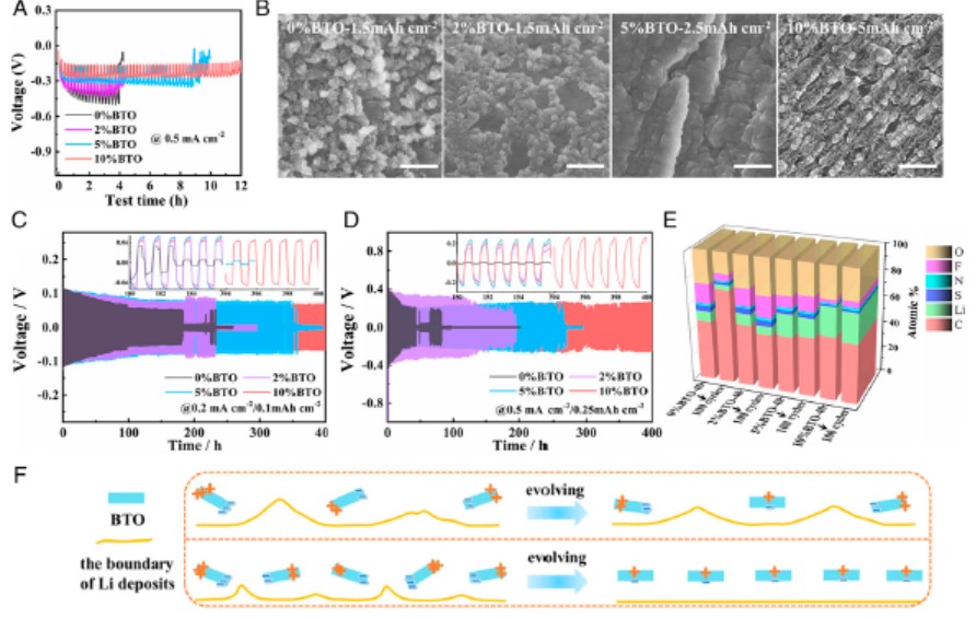 因具有高能量密度和高安全性等优点,固态金属锂电池被广泛认为是下一代电池的重要研发方向。锂枝晶的生长是诱发界面不稳定行为和电池安全隐患的重要因素,但迄今在任何固体电解质中都很难完全避免枝晶锂的形成。必一在线平台(中国)官网林应斌教授、黄志高教授团队将具有介电/铁电效应的BaTiO3纤维融入到固态电介质中,调控锂枝晶的成核与生长过程。理论模拟研究发现,固态电解质中BaTiO3的介电效应可以有效减少高电流密度下锂枝晶生长驱动力,铁电效应则可以降低过电势进而调控锂沉积和Li+流。系列先进表征技术表明,固态电解质中极化反转确实可以调控锂的沉积和形貌。以LiFePO4为正极、以融有BaTiO3的石榴石PEO聚合物为电解质组装成固态电池具有稳定的循环寿命,在1C电流密度下循环500圈后仍有103.2 mAh/g。