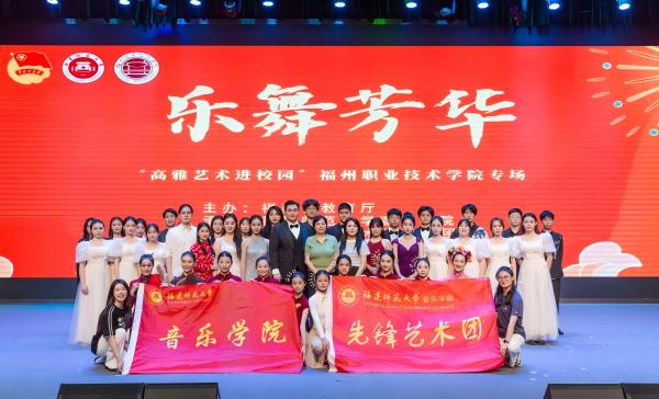 近日,音乐学院先锋艺术团师生40余人赴福州职业技术学院开展“高雅艺术进校园”专场演出,活动由福建省教育厅、福建省文化和旅游厅主办,福州职业技术学院和音乐学院共同承办。当晚,原创群舞《金苍绣》拉开了演出的序幕。音乐学院师生相继带来了《一步之遥》《敦煌新语》《梦入江南》《等着我亲爱的人》《天边有颗闪亮的星》《可爱的一朵玫瑰花》《红火烧高粱》《挽面》等节目,为现场观众呈现了一场集舞蹈、歌曲、乐器演奏等多种艺术形式的演出,气氛热烈,掌声不断。活动在合唱《登山缆车》中结束。(音乐学院)