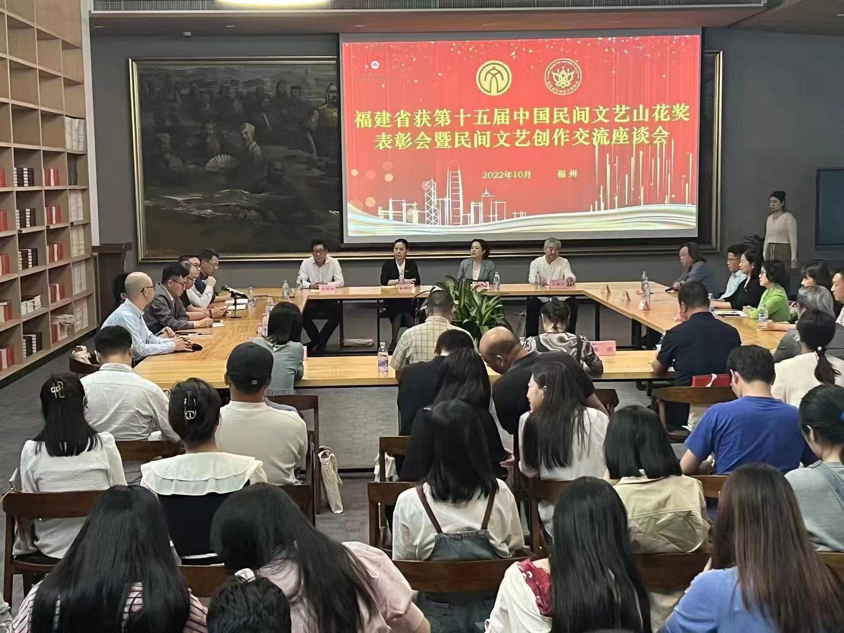 表彰会上,王来文宣读了第十五届中国民间文艺山花奖评奖结果,李豫闽介绍了福建省获奖情况,获奖作者蓝泰华、吴德强和工艺美术界代表郑幼林分别在会上作了发言。表彰会后举行了民间文艺创作交流会,就高校美术创作如何与民间文艺创作深度融合等话题进行了深入交流研讨。