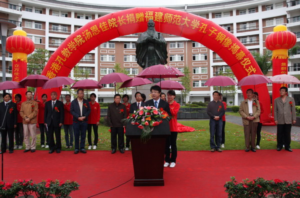 李韧代表省委统战部向仪式的举行表示热烈的祝贺!向汤恩佳先生表示诚挚的谢意!他在致辞中指出,汤恩佳先生向福建师大捐赠孔子铜像,其情可嘉,其举堪颂,表明汤先生对福建师大的支持和厚爱,作为负有创造人类心灵神圣任务和福建“教师摇篮”的师范大学,矗立孔子铜像使广大教职员工和青年学生及所有前来瞻仰的人们,能够见贤思齐,思考孔子教诲,对于培养爱祖国、爱民族的情感,产生激励作用,对福建师大进一步弘扬中国优秀传统文化、提高人文素养、建设和谐校园文化等将发挥积极的作用。