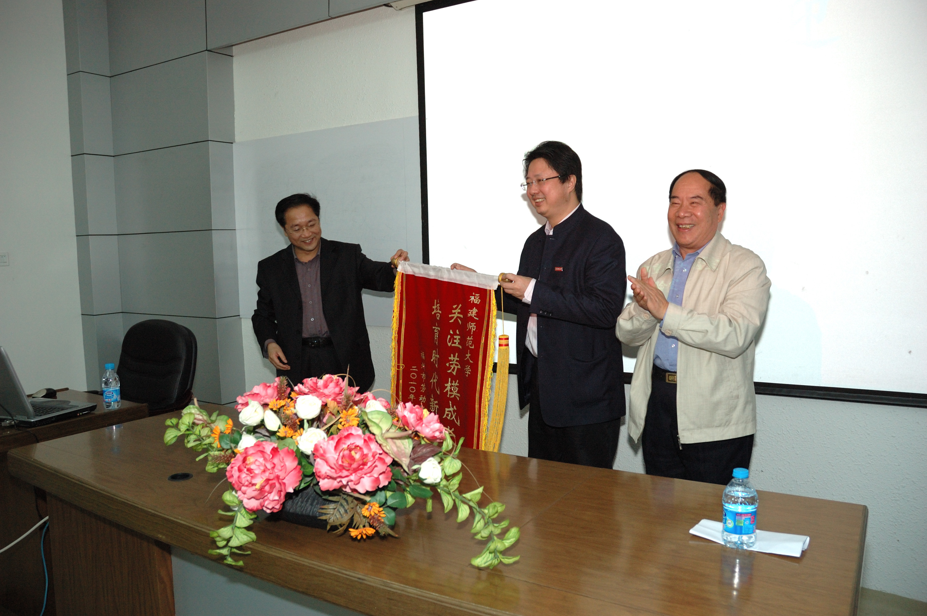 黄汉升校长对“劳模进校园活动”走进师大表示欢迎,对福州市总工会和劳模协会对必一在线平台(中国)官网教学、科研、实验室建设和工会工作的关心和支持表示感谢。张旭村介绍了“劳模进校园活动”的目的、意义,高度评价了必一在线平台(中国)官网的劳模工作,并向必一在线平台(中国)官网赠送了“关注劳模成长,培育时代新风”锦旗。
