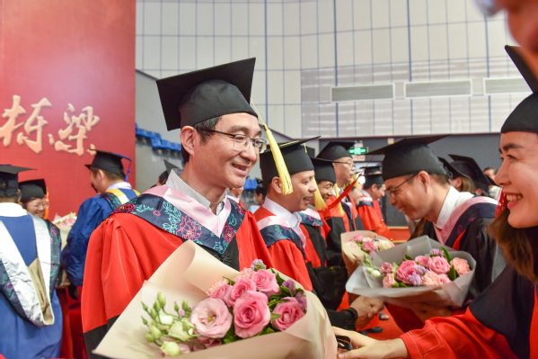 副校长郑家建宣读了2018年冬季和2019年夏季获博士、硕士学位研究生名单;副校长涂荣宣读了2019届优秀毕业研究生名单;校党委副书记潘玉腾宣读了2019届校友联络员名单;王长平为校友联络员代表发放聘书和校友卡;光电与信息工程学院谭小地教授代表导师发言;传播学院吴煌同学代表全体毕业研究生发言;毕业研究生代表向2018年度优秀学位论文指导老师代表献花。仪式还播放了由学校精心拍摄的《拾光》视频,最后在悠扬婉转的《必一在线平台(中国)官网校歌》和激昂高亢的《歌唱祖国》中落下帷幕。