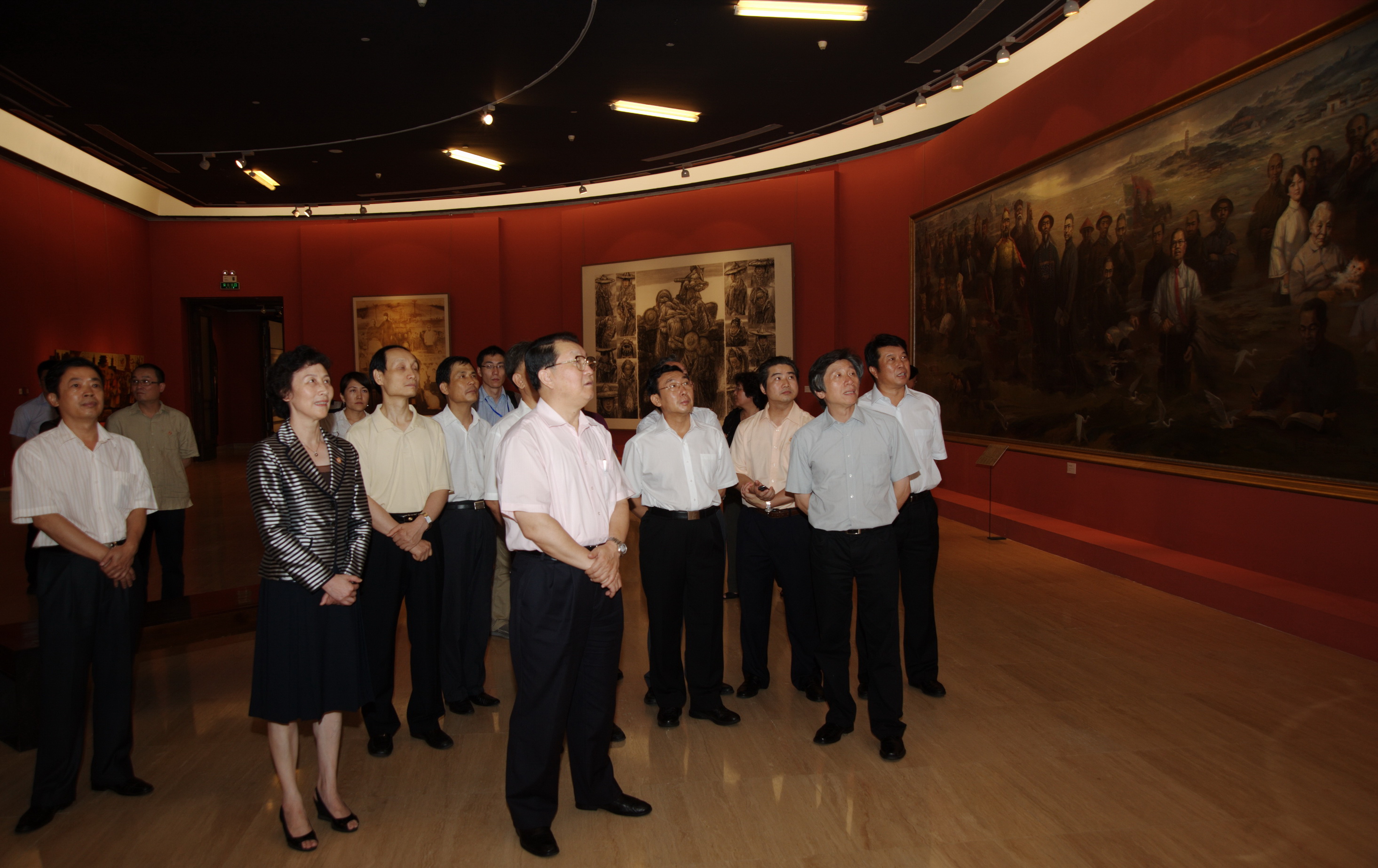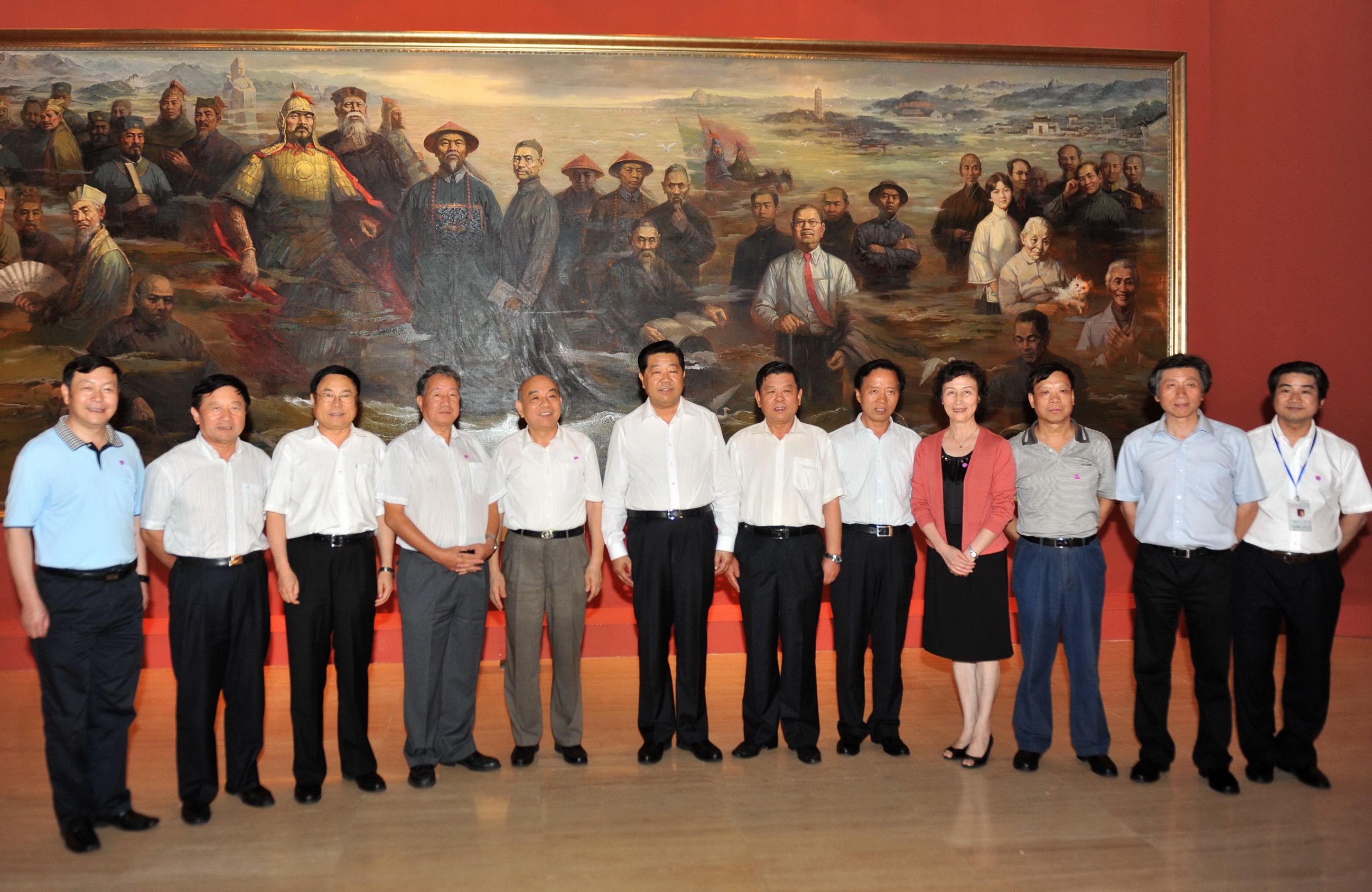 8月11日下午,中共中央政治局常委、全国政协主席贾庆林参观展览并在《闽水万古流》作品前合影留念