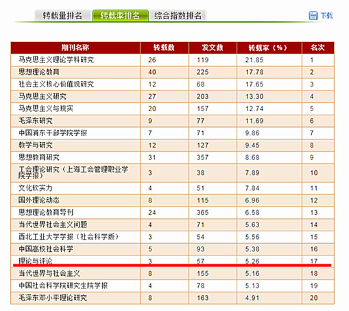 据悉,该排名根据人大复印报刊资料近100种学术刊的全文转载数据,从转载量、转载率、综合指数三个维度统计形成。