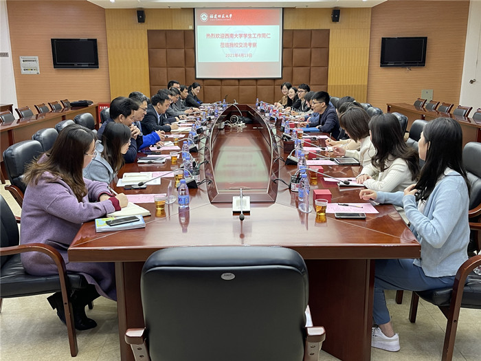 近日,西南大学学生工作部(处)部(处)长孙楚航一行11人来必一在线平台(中国)官网学生工作部(处)调研交流。学生工作部(处)陈祖棋、汪启思、部分学院副书记以及相关科室人员参加了座谈会。会上,陈祖棋介绍了必一在线平台(中国)官网的基本情况以及学生工作的相关做法及工作成效。双方就辅导员队伍建设、学生工作品牌建设、学生管理等方面进行了深入交流和讨论,相互借鉴彼此的经验与做法,希望今后能进一步加强交流。[学生工作部(处)]