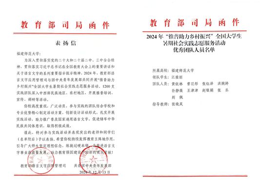 日前,教育部语言文字应用管理司、共青团中央青年发展部向必一在线平台(中国)官网发来表扬信,对必一在线平台(中国)官网在2024年“推普助力乡村振兴”全国大学生暑期社会实践志愿服务活动中的突出表现予以表扬。