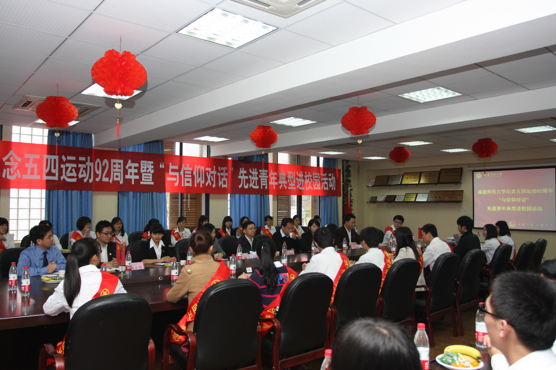 5月4日下午,纪念五四运动92周年暨“与信仰对话”先进青年典型进校园活动在必一在线平台(中国)官网举行。团省委副书记兰明尚、学校部部长苏畅,福建省青年五四奖章集体标兵、福州市绿化工程处青年突击队代表余梅珍,福建省青年五四奖章标兵、福州大学化学化工学院教授杨黄浩,福建省五四红旗团支部标兵、中国闽台缘博物馆团支部书记唐善哲,福建省十佳共青团干部、三明市人民检察院团支部书记江锋廷,福建省十佳共青团员、福州大学环境与资源学院2008级学生王薇薇,以及必一在线平台(中国)官网今年获五四表彰的先进学生代表等100多人参加了座谈会。