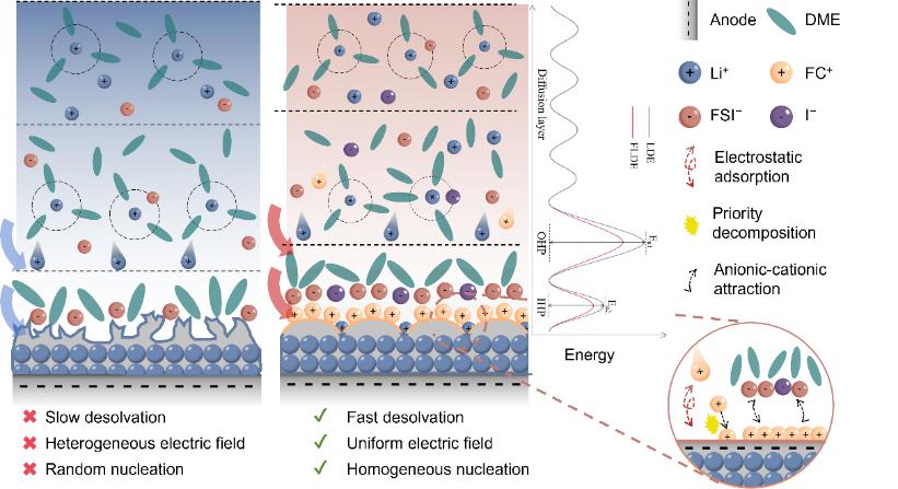 必一在线平台(中国)官网陈育明教授团队研究了一种含氟、氮和碘元素新型添加剂(FCS),通过添加剂阳离子选择性吸附在电极表面,有效地调节电极表面电场,从而促进锂的均匀沉积。同时,FCS的优先分解产生了一个包含氟化锂、氮化锂和碘化锂成分的SEI,其具有高杨氏模量和离子导电性能,能够在大电流条件下稳定锂金属负极。近日,相关工作发表在《Angewandte Chemie International Edition》上。