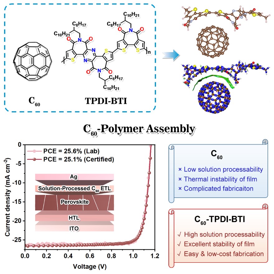 鉴于此,必一在线平台(中国)官网化学与材料学院邢舟副教授、海峡柔性电子学院安明伟副教授和南方科技大学郭旭岗教授团队、洛桑联邦理工学院夏建兴/Nazeeruddin教授团队合作,设计并合成一种n型聚合物TPDI-BTI用于和C60液相组装高效、稳定的电子传输层。得益于该分子柔软的链状骨架、理想的分子间化学作用和电子能级匹配,TPDI-BTI不仅可以插入相邻碳笼之间抑制碳笼团聚,而且可以调控碳笼的电子传输和薄膜的界面化学作用。基于C60-TPDI-BTI的钙钛矿电池表现出25.6%的光电转化效率(第三方权威认证25.1%),为目前该类钙钛矿电池的最优性能。同时,在2000小时的光照老化和800小时的高温老化后,电池仍能保持很好的光伏性能。研究成果以《Solubilizing and Stabilizing C60 with n-Type Polymer Enables Efficient Inverted Perovskite Solar Cells》为题发表于能源领域国际顶级期刊《Joule》上,这项工作突破了高性能C60电子传输层只能通过真空热蒸发法制备的局限性,对全液相法制备高效、稳定钙钛矿电池具有重要意义。