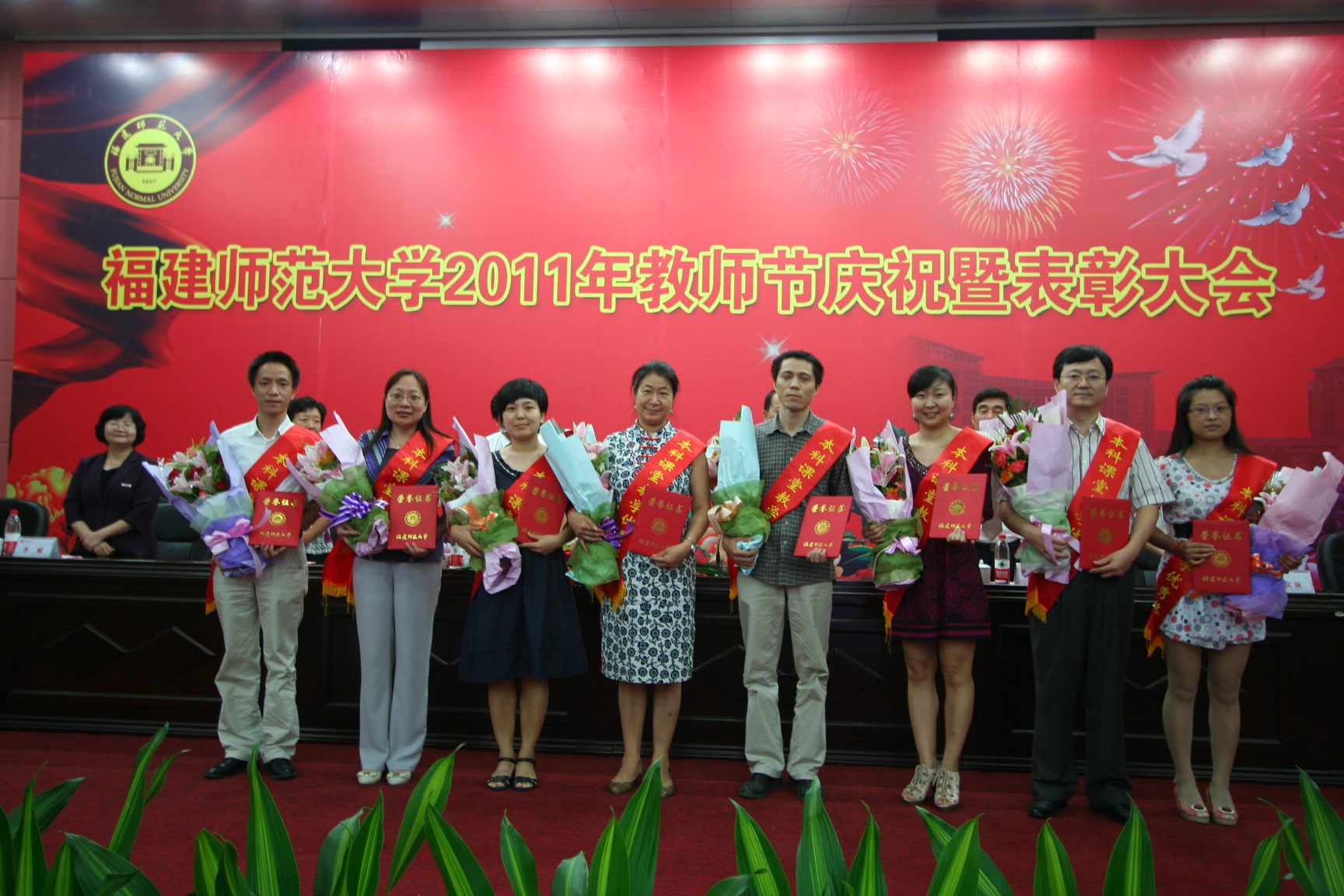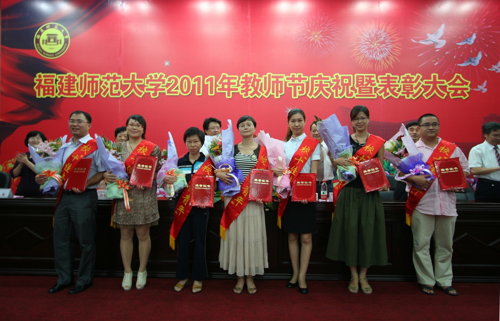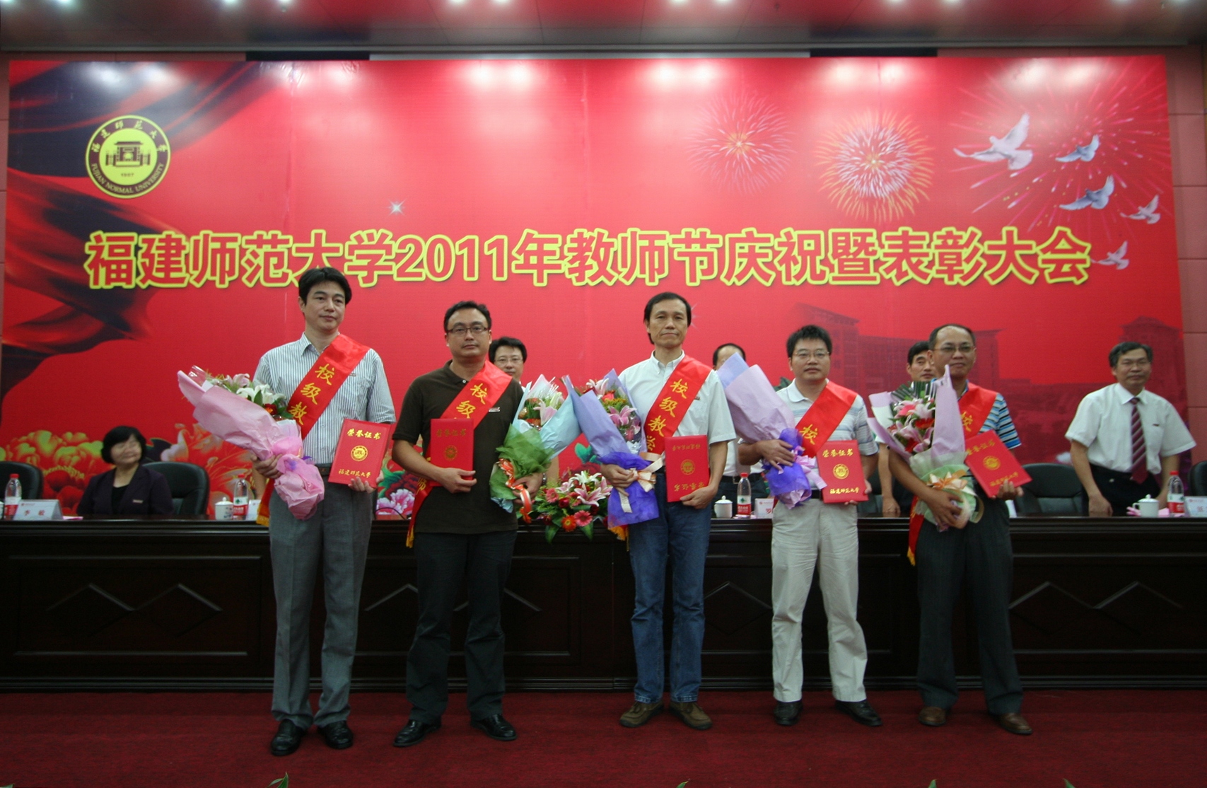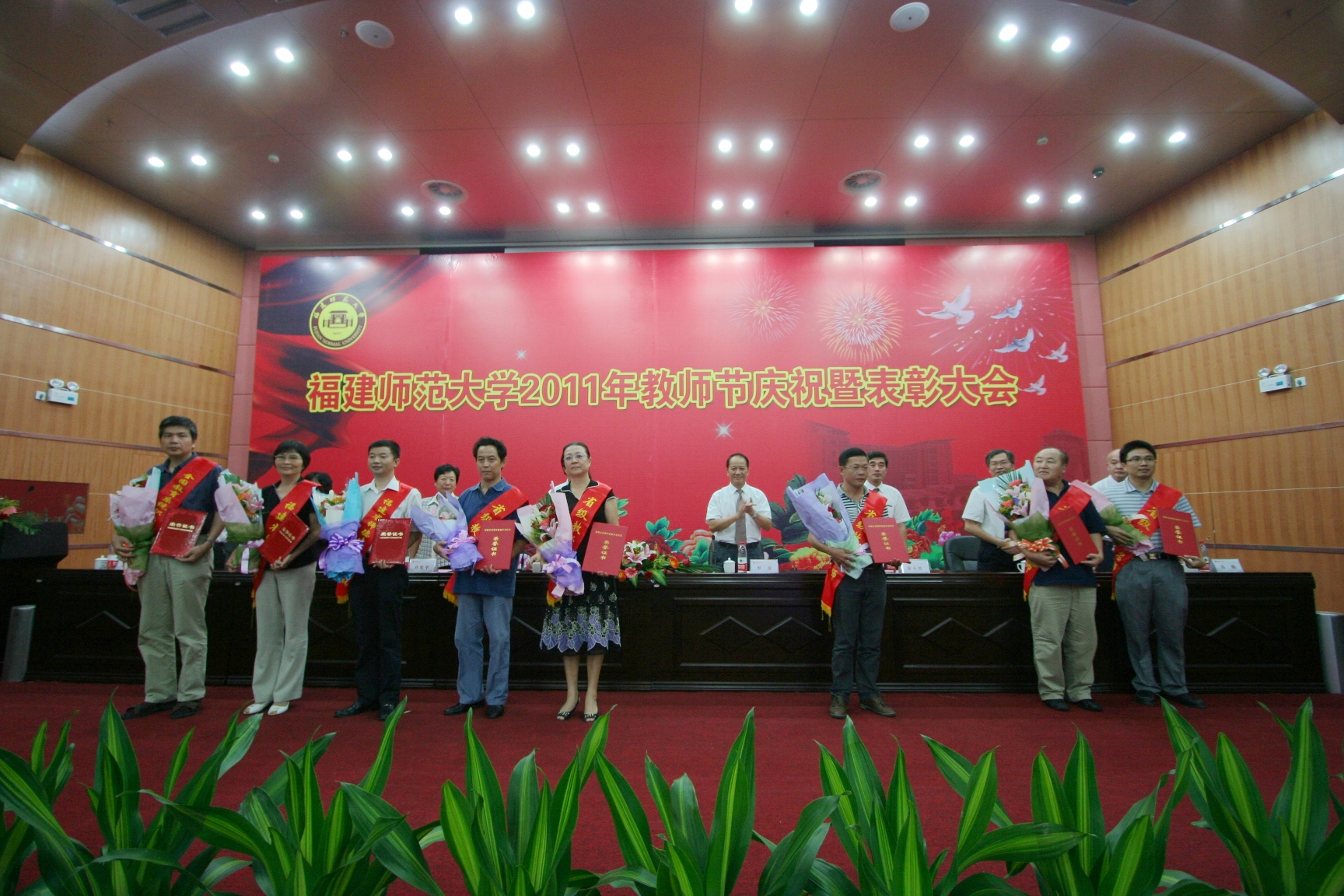 汪文顶副校长宣读了2011年教师节表彰名单。校领导为全国教育系统职业道德建设标兵,省师德建设先进集体、省师德标兵,省级、校级教学名师,校第五届十佳青年教师,校2009年度本科课堂教学优秀奖获得者颁奖。马克思主义学院俞歌春教授、校学生会主席蒲鑫源同学分别代表全校师生发言,向全体教师送上节日的祝福。文学院辜也平教授、体育科学学院陈海春教授、生命科学学院张明凤副教授分别介绍了先进事迹和从教体会。