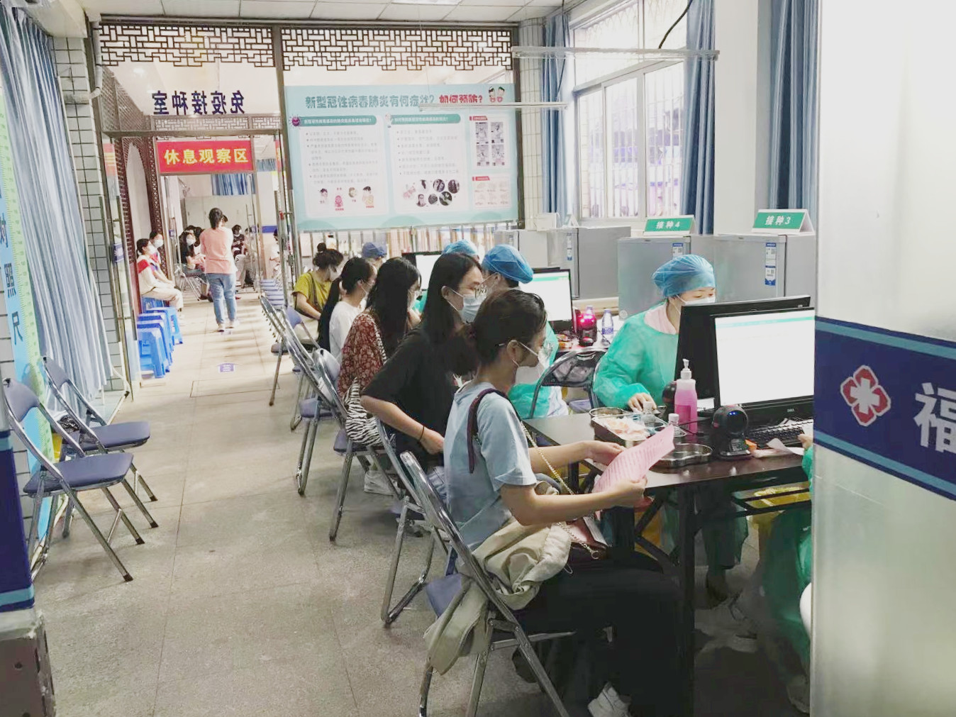 (志愿者引导接种人员分批有序进入接种现场)