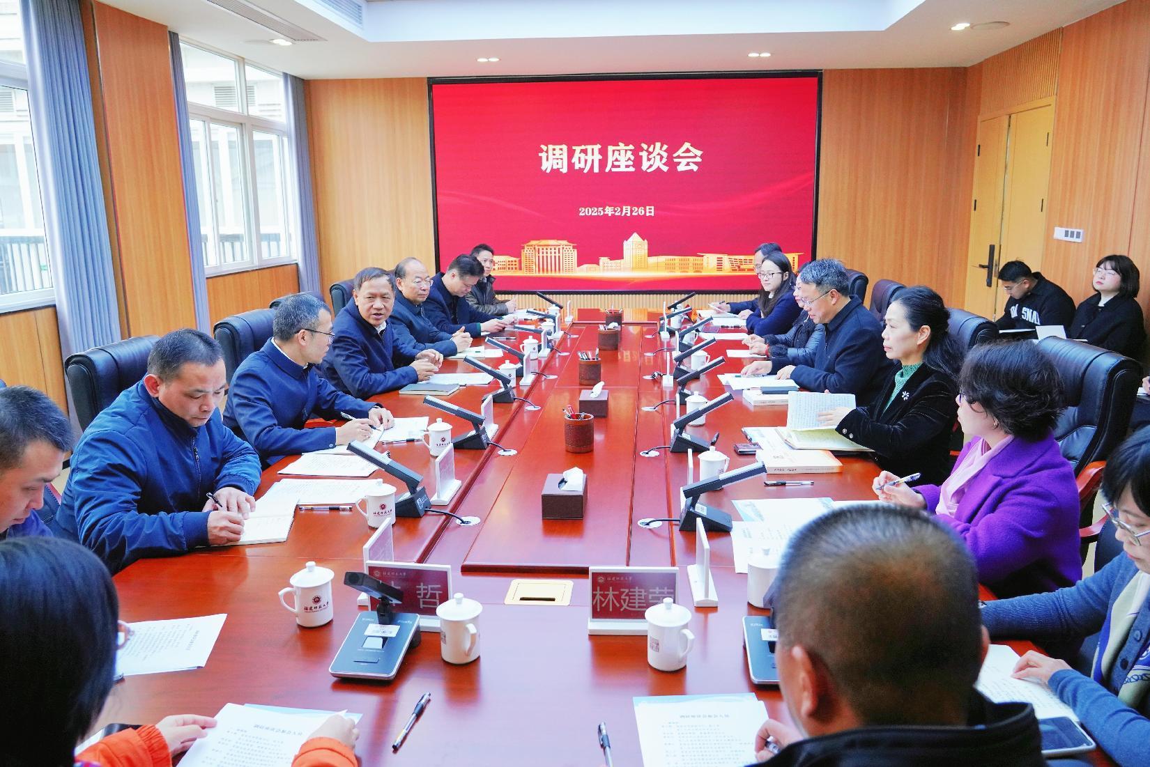 2月26日,省政协党组副书记、副主席,省人民政协理论研究会会长黄文辉带领省政协常委、提案委员会主任胡忠昭,省政协机关党组成员、研究室主任,省人民政协理论研究会副会长兼秘书长黄国剑以及福州市政协相关负责同志等一行来校调研。校党委书记潘玉腾、党委副书记陈晓红,党政办公室、统战部、社会科学处和马克思主义学院负责人以及教师代表参加调研座谈。