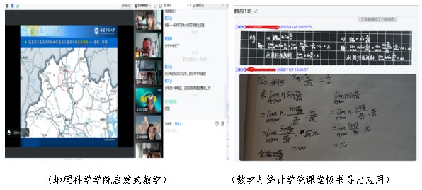 理论课堂师生互动增强。针对理论课堂特点,各学院持续加强课堂互动的趣味性。教育学院采用“小组分享-全班交流-师生总结”的方式,强化课堂应用;经济学院运用“小组汇报-点评讲解-案例分析讨论”的“三段式”教学设计,线上课堂气势氛活跃;地理科学学院注重启发式教学,以学生自主提问和教师随机抽查相结合的方式,增加线上教学的灵活性和趣味性。数学与统计学院的课堂注重了解学生学习情况,教师边“刷屏”边现场点评和讲评。将上课的板书以PDF文档形式导出上传至“学习通”供同学们复习。