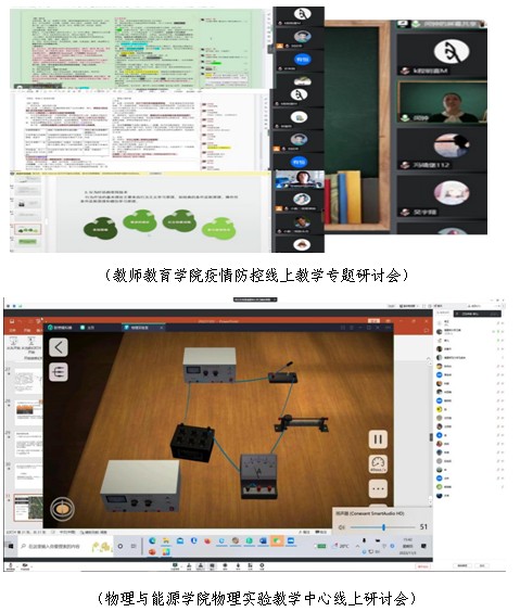 线上教研提升专业素养。各学院围绕课程思政元素渗透、教学手段应用、线上互动等教学过程中的重点难点问题,开展多场不同主题的线上教研活动,引导教师拓宽线上教学思路,提升线上教学能力。物理与能源学院物理实验教学中心在线开展“关于调整本中心承担的实验课程教学安排”研讨会;法学院组织各教研室开展主题为“如何提高线上课堂教学能力”专题研讨活动;教师教育学院召开以“线上教学的质量保障和提升”为主题的线上教学专题研讨会,学院全体一线教师就这一主题开展深入交流和探讨。化学与材料学院就本科线上教学质量提升问题,开展本科教学工作研讨会。