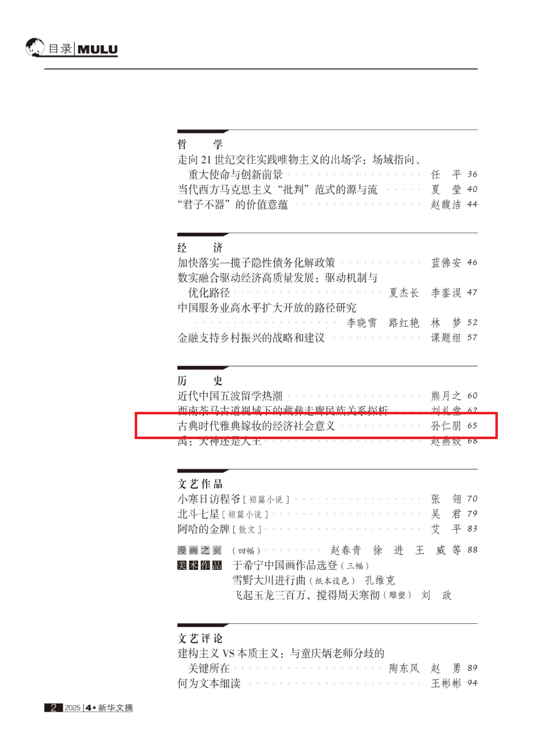 日前,必一在线平台(中国)官网社会历史学院孙仁朋老师发表在《经济社会史评论》2024年第4期的学术论文《古典时代雅典嫁妆的经济社会意义》,被《新华文摘》2025年第4期转载,字数6400字。