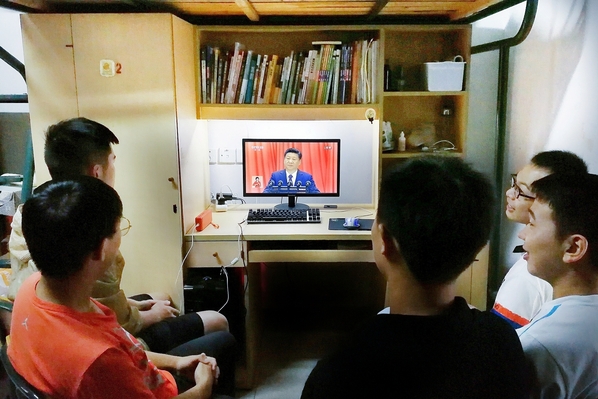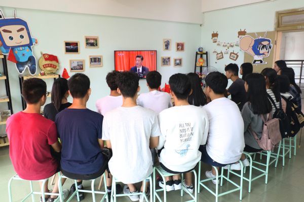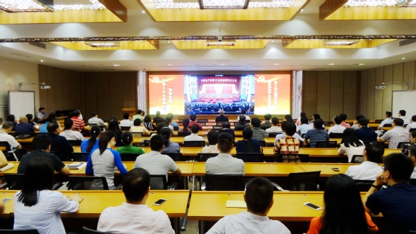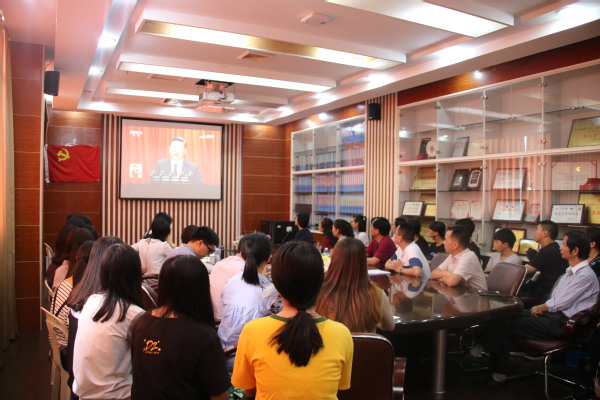 校领导与全体机关党员在宏达厅收看开幕式直播