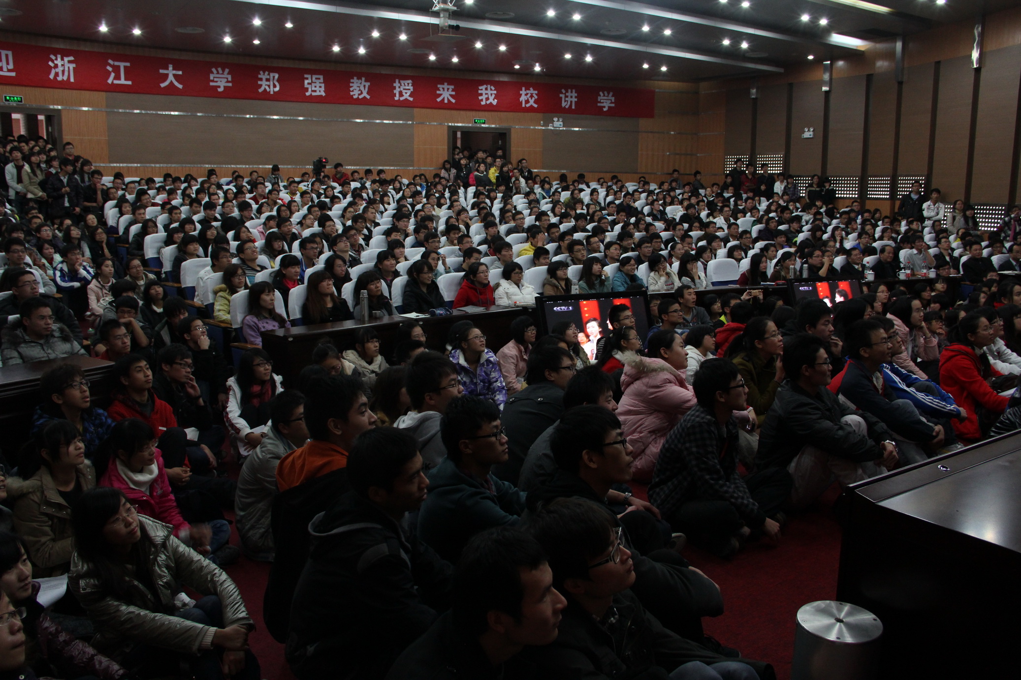 郑强教授结合自己的成长经历、为师之道和教育人生,以十五条“强哥语录”为线索,从教师、学生、教育、中国青年肩负的使命等角度,深入阐释他对当代大学生价值取向与历史责任的见解。他说“成为一名学生喜爱的老师要有真才实学、要有爱生之心、要有沟通本领”,强调教师是一个要用心用情去付出的职业。他鼓励同学们努力挖掘自己的非对称优势,在大学里学会坚持,“爱自己的专业如同爱自己的生命”,形成自己的核心竞争优势。他强调成功的大学教育就是要让学生“有精神的领悟、有情感的充实、有生活的平和”。他还对从辛亥革命到改革开放的中国发展作了精辟的解读,列举一个个生动鲜活的爱国实例,告诉同学们“没有民族精神的凝聚,国家就没有力量”,号召同学们坚定“振兴中华从我做起,强盛中华要我顶起”的信念,肩负起中华民族赋予青年人的历史使命。最后,他希望当代大学生要做一个懂得感恩的人,爱祖国、爱社会、爱学校、爱父母,并叮嘱在场同学听完讲座后,要给自己的妈妈打个电话。郑强教授语重心长的话语,让许多青年学生流下感恩的泪水。