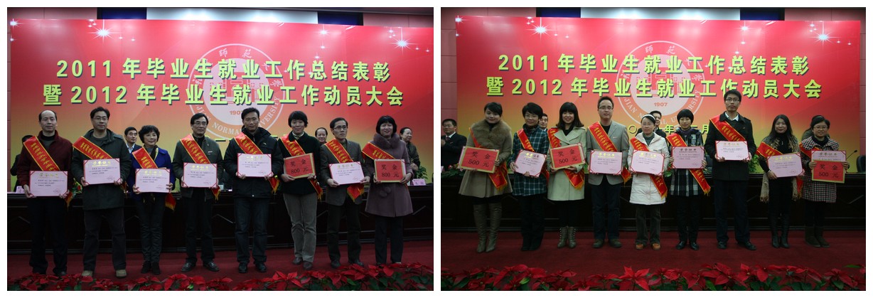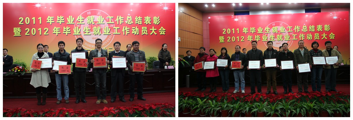 大会对2011年本专科毕业生就业率前六名的旅游学院、软件学院、经济学院、人民武装学院、信息技术学院、传播学院、福清分校,对2011年本专科毕业生签约率前六名的社会历史学院、法学院、人民武装学院、生命科学学院、地理科学学院、公共管理学院,对2011年本专科毕业生就业率增幅前6名的专业,对2011年毕业研究生就业率100%的8个学院,对2011年本专科毕业生一次性就业率超过80%且年终就业率达100%的39个专业,对获得2011年就业工作创新奖的地理科学学院、音乐学院、外国语学院、数学与计算机科学学院,对获得“2010—2011学年毕业生就业工作贡献奖”的涂秀虹等16位同志,对获得“2010—2011学年毕业生就业工作先进个人”的苏杭等27位同志进行了表彰奖励。
