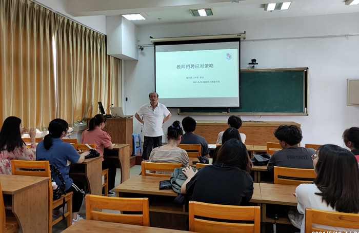 培训会邀请福州三中资深物理学任课教师林杰老师为物理学专业学生作题为《教师招聘应对策略》的报告。报告中,林杰从教案编写、片段教学、说课环节、专家提问等方面,向同学们细致介绍了教师招聘考试面试部分相关环节及注意事项,指导学生有针对性地做好各面试环节的备考工作。
