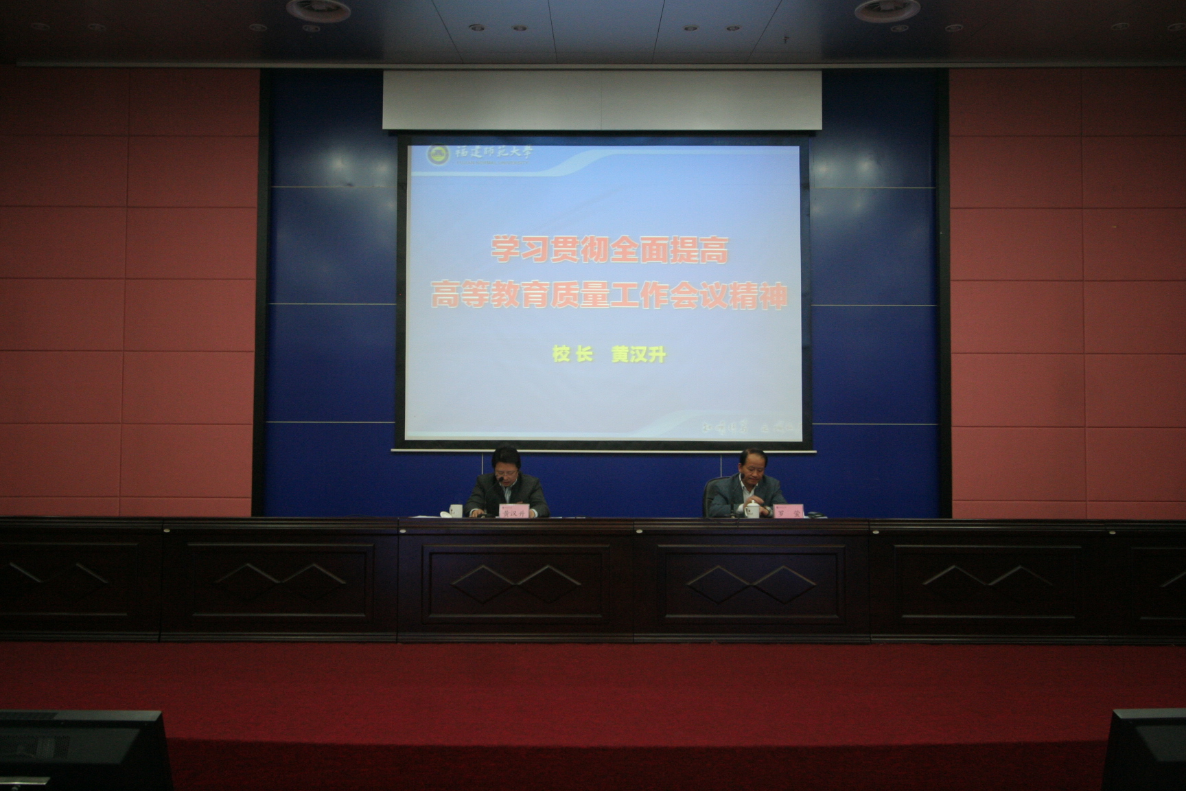 黄汉升校长就学习贯彻全面提高高等教育质量工作会议精神提出三点意见:一是提高认识,转变观念,树立科学的教育观。二是突出重点,深化改革,全面提高教育教学质量。三是完善制度,加强领导,为提高质量提供条件保障。