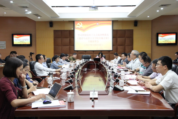 潘玉腾从两个方面对进一步建好马克思主义学院进行部署。一是马克思主义学院要在学习贯彻党的十九大精神上走在前头,起好引领。学习宣传贯彻党的十九大精神是学校当前和今后一个时期的首要政治任务,必须抓紧抓实抓好。学习要有厚度,要准确掌握核心要义和精神实质;研究要有深度,要积极开展前瞻性、战略性、对策性专题研究;宣讲要有广度,要突出课堂主渠道作用、发挥党委讲