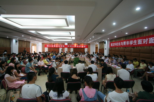 交流会于6月2日上午在旗山校区第九会议室召开。黄汉升校长带领学校办公室、宣传部、学工部、研工部、保卫处、校团委、教务处、国际合作与交流处、财务处、后勤管理处、基建处、仓山校区管理办、后勤服务集团、图书馆、校医院、网络运维部等有关单位负责人,与从短信、网络报名者中抽取的150位学生代表围坐在一起,亲切交流,共话发展。交流会由校学生会主席蒲鑫源同学主持。