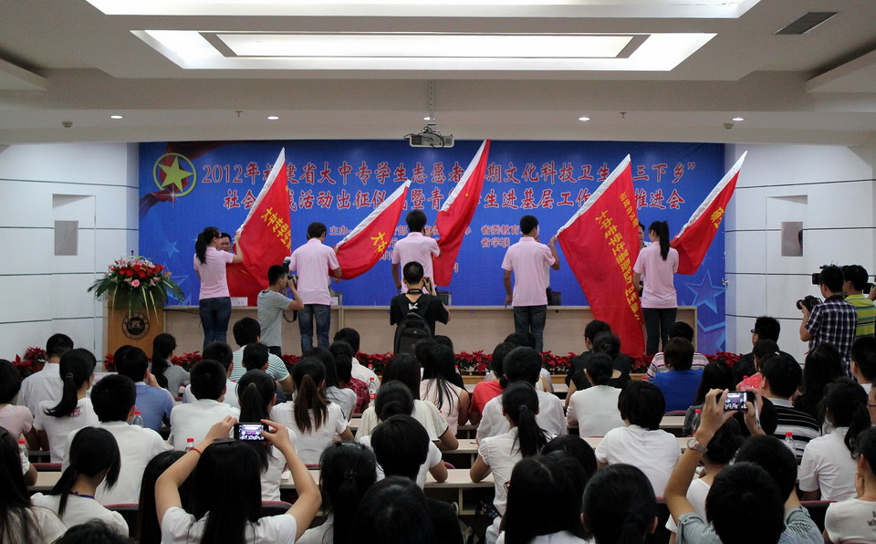 6月21日下午,2012年福建省大中专学生志愿者暑期文化科技卫生“三下乡”社会实践活动出征仪式暨青年学生进基层工作阶段推进会在必一在线平台(中国)官网举行。团省委主持工作副书记何明华,省委教育工委副书记郭绍生,省委宣传部教育处调研员许祖贤,必一在线平台(中国)官网党委书记罗萤等出席了启动仪式;省委宣传部、省委教育工委、团省委、省学联相关部门负责人,福州大学等10所在榕高校团委负责人、学生代表,必一在线平台(中国)官网各学院团委书记和暑期社会实践志愿者代表、青年学生进基层代表250余人参加了出征仪式。仪式由团省委副书记兰明尚主持。
