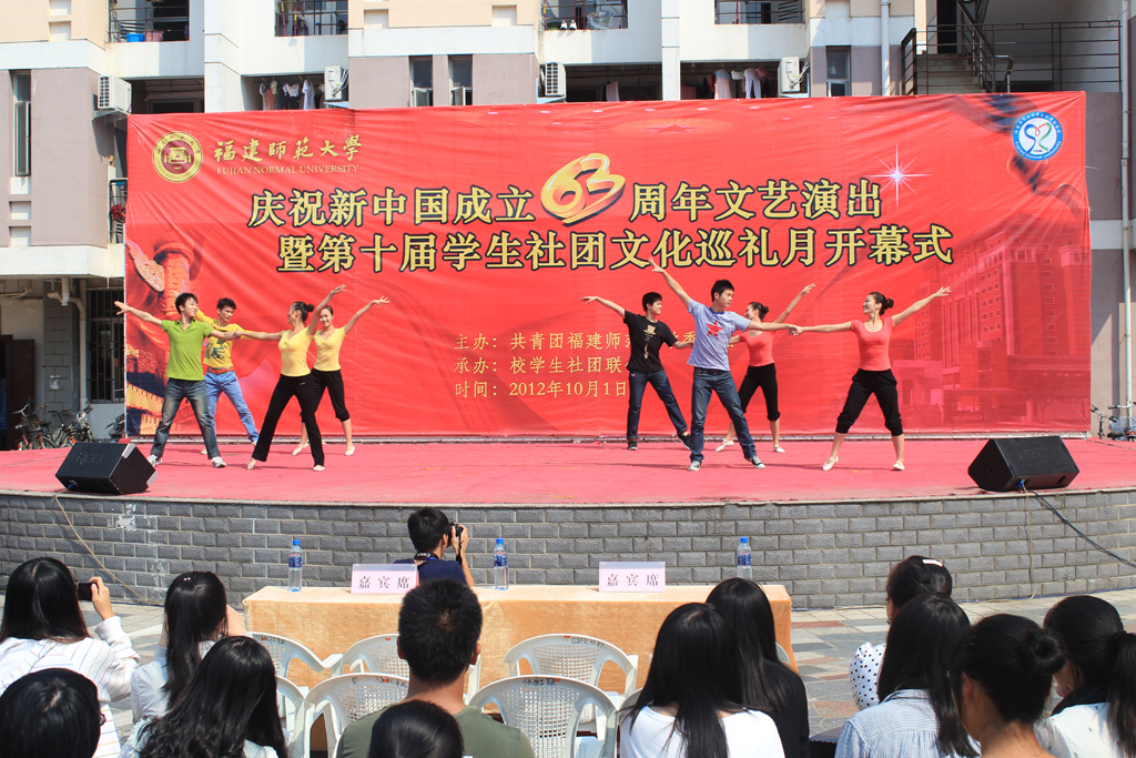 同时,“庆祝新中国成立63周年文艺演出暨第十届学生社团文化巡礼月开幕式”在旗山校区共青团广场热闹开演。来自各学院、各社团协会的同学们纷纷登台演绎精彩节目,尽情展现学生社团的无限活力,深情祝福祖国繁荣昌盛。校社联还特地带来了原创诗朗诵《我只有一个师大》,为母校105年华诞献上祝福。