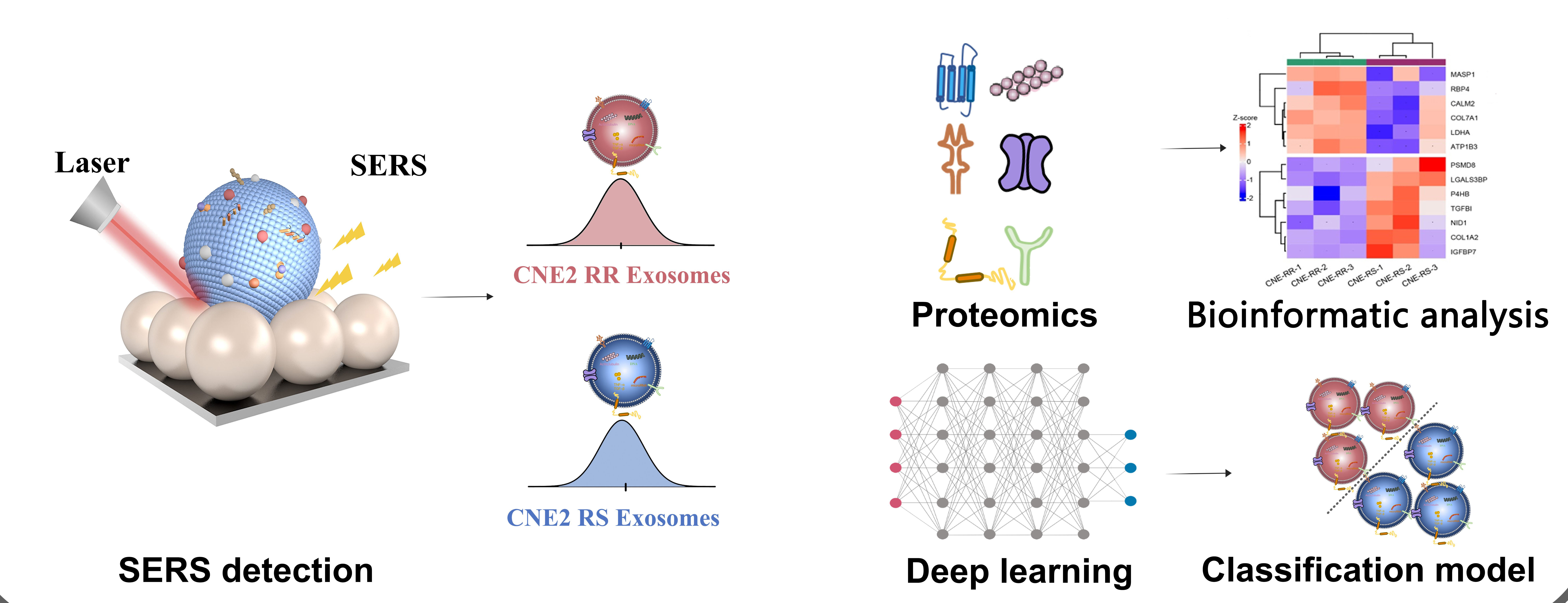 近日,必一在线平台(中国)官网光电与信息工程学院林多教授、冯尚源教授课题组利用表面增强拉曼光谱(SERS)技术联合蛋白质组学首次揭示了鼻咽癌放疗抵抗细胞相关外泌体的拉曼分子图谱,并确定了LDH、COL7A1和COL1A2等与放疗抵抗形成相关的蛋白分子。生物信息分析提示在放疗抵抗外泌体中下调的COL1A2与DNA修复因子呈负相关,并伴随不良预后。此外,通过深度学习算法对外泌体光谱数据进行特征提取与分析,可构建高效的诊断模型对放疗敏感与放疗抵抗的两类外泌体进行判别,准确率可达92.4%。以上结果表明外泌体可作为鼻咽癌放疗抵抗评估的潜在标志物,而基于SERS光谱技术的外泌体检测有望发展成为一种快速、灵敏的光学液体活检新方法,助力临床肿瘤的个性化精准医疗。