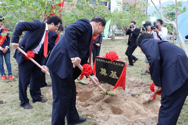 罗萤书记、黄汉升校长、王建南副书记、李永青处长共同为研究生院大楼奠基培土。