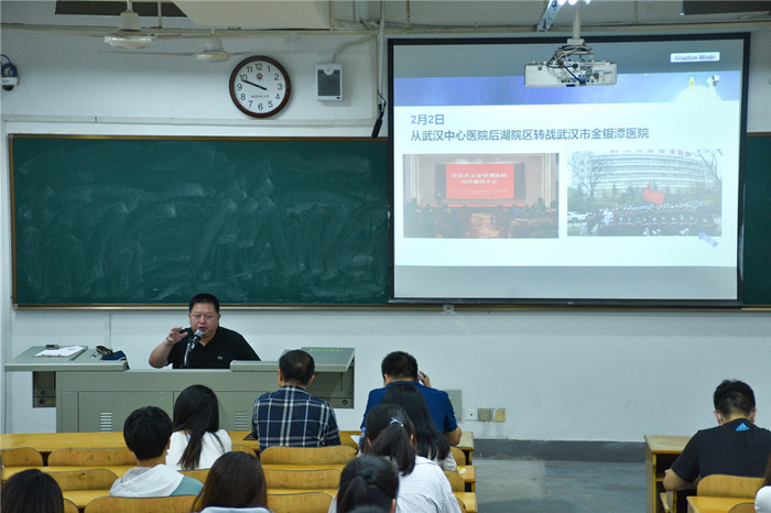 报告会从福建首批援鄂医疗队员原创歌曲视频《提灯女神》引入,宁永鑫分享了福建首批援鄂医疗队赴武汉金银潭医院抗疫救援,在武汉奋战58天的“抗疫”故事。医疗队临时党委在武汉守初心、担使命,累计管理患者246人、治愈出院165人,患者“零死亡”、医护“零感染”,向党和人民递交了一份“高分答卷”。宁永鑫以自身经验和感悟号召青年人积极向党组织靠拢,勇于担当,鼓励青年人要“敢作为、有作为”。
