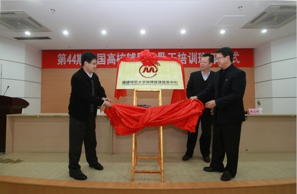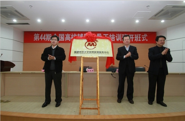 开班暨中心揭牌仪式于12月7日上午在旗山校区第九会议室举行。教育部思政司组宣处处长徐艳国,省委教育工委副书记刘剑津,校领导黄汉升、林和平,培训班全体成员,各学院团委书记、微博管理员等参加了仪式。仪式由校党委副书记林和平主持。