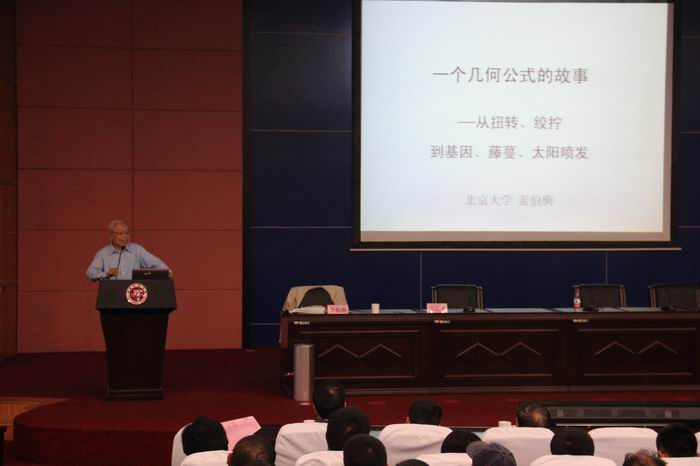 姜院士的报告以《一个几何公式的故事 —— 从扭转、绞拧到基因、藤蔓、太阳爆发》为题,围绕拓扑学上的一个几何公式“Lk=Tw+Wr”展开论述。他阐述了该公式的基本含义,引用了该公式在生物学、天体物理学等学科上被成功应用的几个趣味故事,展示了该公式推动人类科技发展的重要意义。他结合个人经历,与大家分享了数学之美与学科交叉之妙,指出科学的发展离不开各国间的学术交流,也离不开各个学科之间的融合交流,勉励青年师生开拓交叉学科的新境界。姜院士精彩的报告赢得了阵阵掌声。