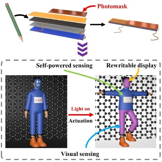 该研究成果以《Pencil-Drawn Generator Built-in Actuator for Integrated Self-Powered/Visual Dual-Mode Sensing Functions and Rewritable Display》为题发表于国际学术期刊《Advanced Science》。该论文第一单位为必一在线平台(中国)官网,必一在线平台(中国)官网硕士研究生古万松、福建工程学院周培迪博士为共同第一作者,陈鲁倬教授为唯一通讯作者。该研究工作得到国家自然科学基金面上项目、福建省自然科学基金重点项目、福建省青年拔尖人才计划等的资助。