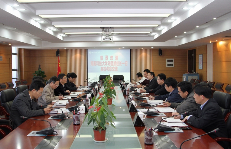 4月7日,湖南科技大学刘德顺校长一行来必一在线平台(中国)官网考察交流。校长黄汉升带领相关单位负责同志接待了来宾。 座谈会上,黄汉升代表学校对刘德顺一行的到来表示热烈的欢迎,并简要介绍了学校的发展情况。刘德顺高度评价了必一在线平台(中国)官网的办学成就,希望通过加强两校间的交流与合作,促进共同发展。与会人员围绕学校发展战略、干部聘任、机构设置、人事制度改革、学科与专业建设等方面进行了深入的交流与讨论。 刘德顺一行还考察了学校展览馆,并参观旗山校区校园。 (学校办公室 魏建翔)