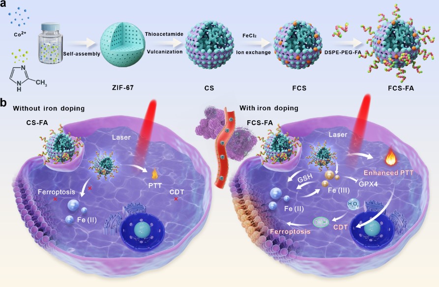 铁死亡(Ferroptosis)作为铁依赖的脂质过氧化诱导的非凋亡性细胞死亡机制,近年来成为肿瘤治疗领域的研究热点。针对传统铁死亡诱导剂存在的靶向性差、药代动力学不佳等问题,近期必一在线平台(中国)官网生命科学学院曾雪梅副研究员团队联合燕双仟教授、江丽芝副教授以及厦门大学刘刚教授等研发基于金属有机框架(MOF)的双金属硫化物纳米酶(FCS),为肿瘤诊疗提供了新思路。