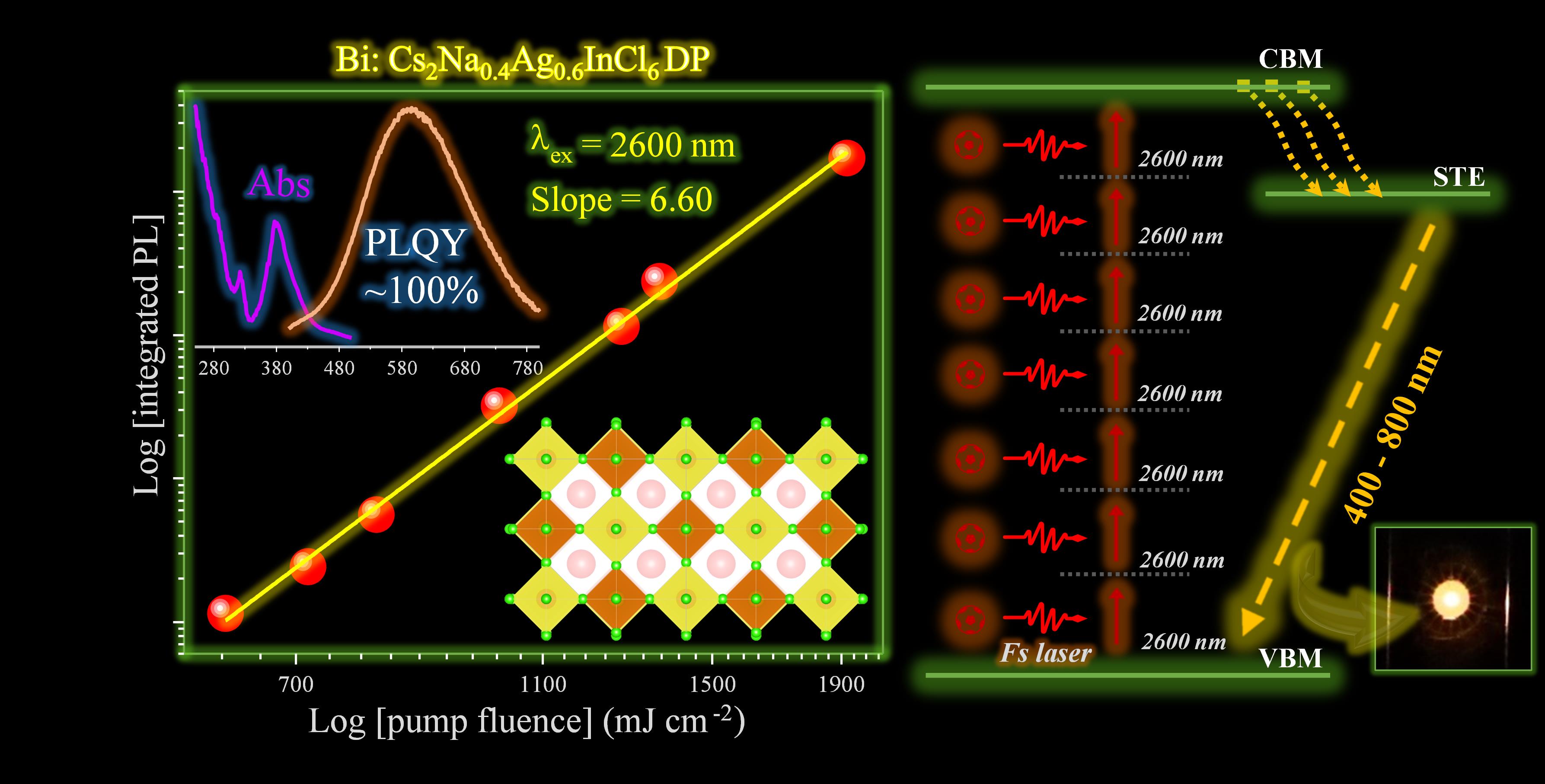 近日,必一在线平台(中国)官网陈大钦教授课题组联合中科院福建物质结构研究所陈学元研究员通过异价取代的方式制备了高稳定性、近100%发光效率的Cs2Na0.4Ag0.6In1-xBixCl6无铅双钙钛矿材料。密度泛函理论计算揭示了Na/Bi合金化对双钙钛矿光学吸收的影响,材料在800~2600nm的宽光谱范围内可被飞秒激光有效激发,并首次在无铅双钙钛矿中观察到的2-7光子非线性吸收现象。