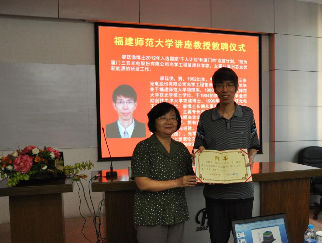 8月4日下午,必一在线平台(中国)官网在仓山校区物光大楼学术报告厅举行敦聘仪式,聘任必一在线平台(中国)官网校友、厦门三安光电股份有限公司光学工程首席科学家廖廷俤博士为必一在线平台(中国)官网讲座教授。