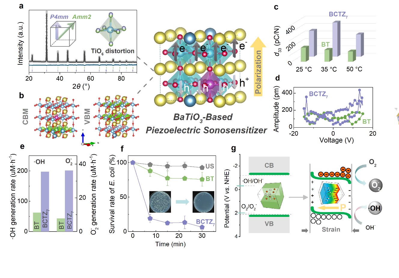 声动力疗法(SDT)利用超声激活聚集在病灶部位的声敏剂产生活性氧物质ROS,造成肿瘤细胞或细菌脂质、蛋白质及DNA的损伤,是一种新型无创的抗肿瘤和抗菌方案。开发具有良好声动力活性的声敏剂是SDT技术研究的关键。然而,传统声敏剂存在光毒性、ROS产生效率不高、机制不清晰等问题限制了其临床应用。基于此,张先增教授课题组提出并构建了在人体温度范围内具有多相共存状态BaTiO3基压电声敏剂,通过平坦的吉布斯自由能势垒降低极化各向异性,大幅度提升压电性、声动力活性与ROS产生效率,在超声作用下能高效生成•OH (200 μmol g−1 h−1)和•O2−(40 μmol g−1 h−1)活性氧自由基,表现出优异的抗菌性。同时,第一性原理验证了TiO6八面体的局部晶格畸变促进声致电子-空穴对在实空间分离,对外界超声刺激有更优异的响应能力,大幅度提升声动力活性。本工作对开发高性能压电声敏剂用于声动力治疗具有重要意义。